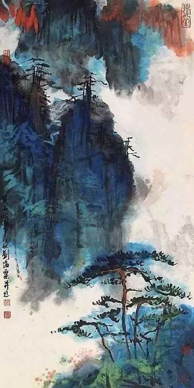 Приемы классического китайского пейзажа и сочетание традиционных элементов с цветными пятнами и брызгами.