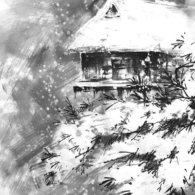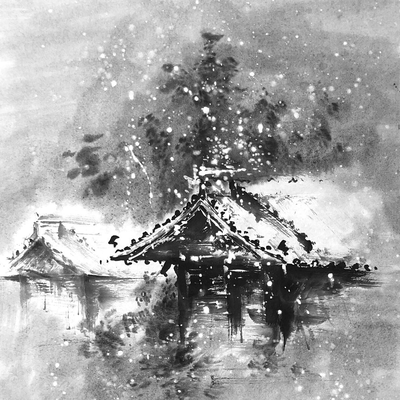 Обучение рисованию заснеженных деревьев, силуэтов гор, деревенского дома и здания храмового комплекса под снегом.